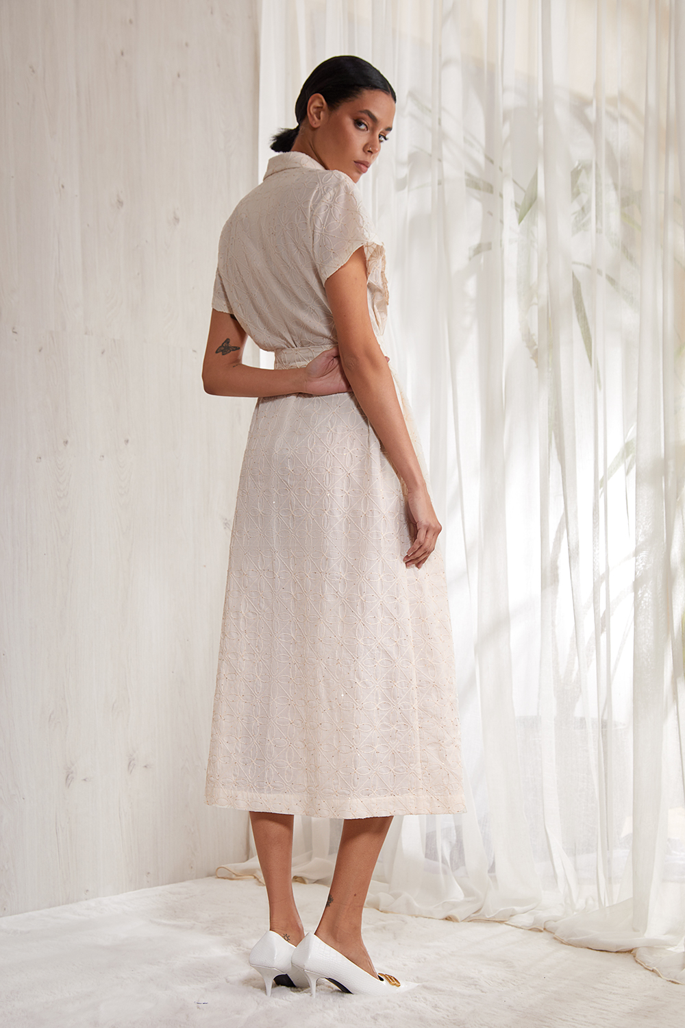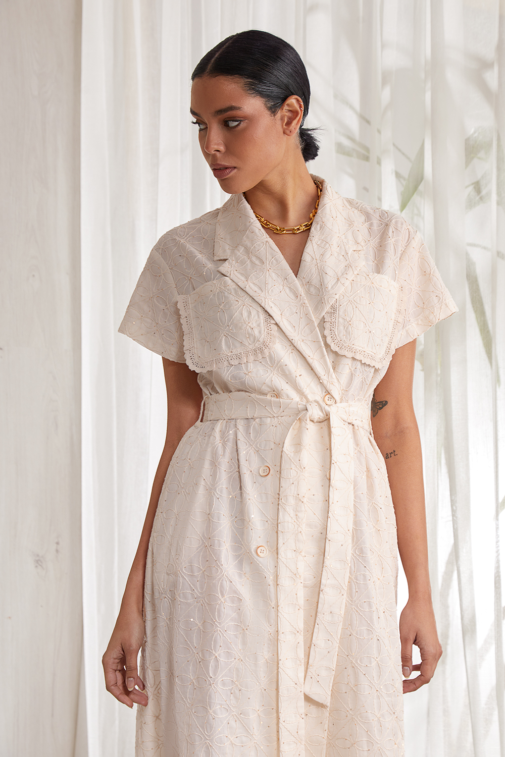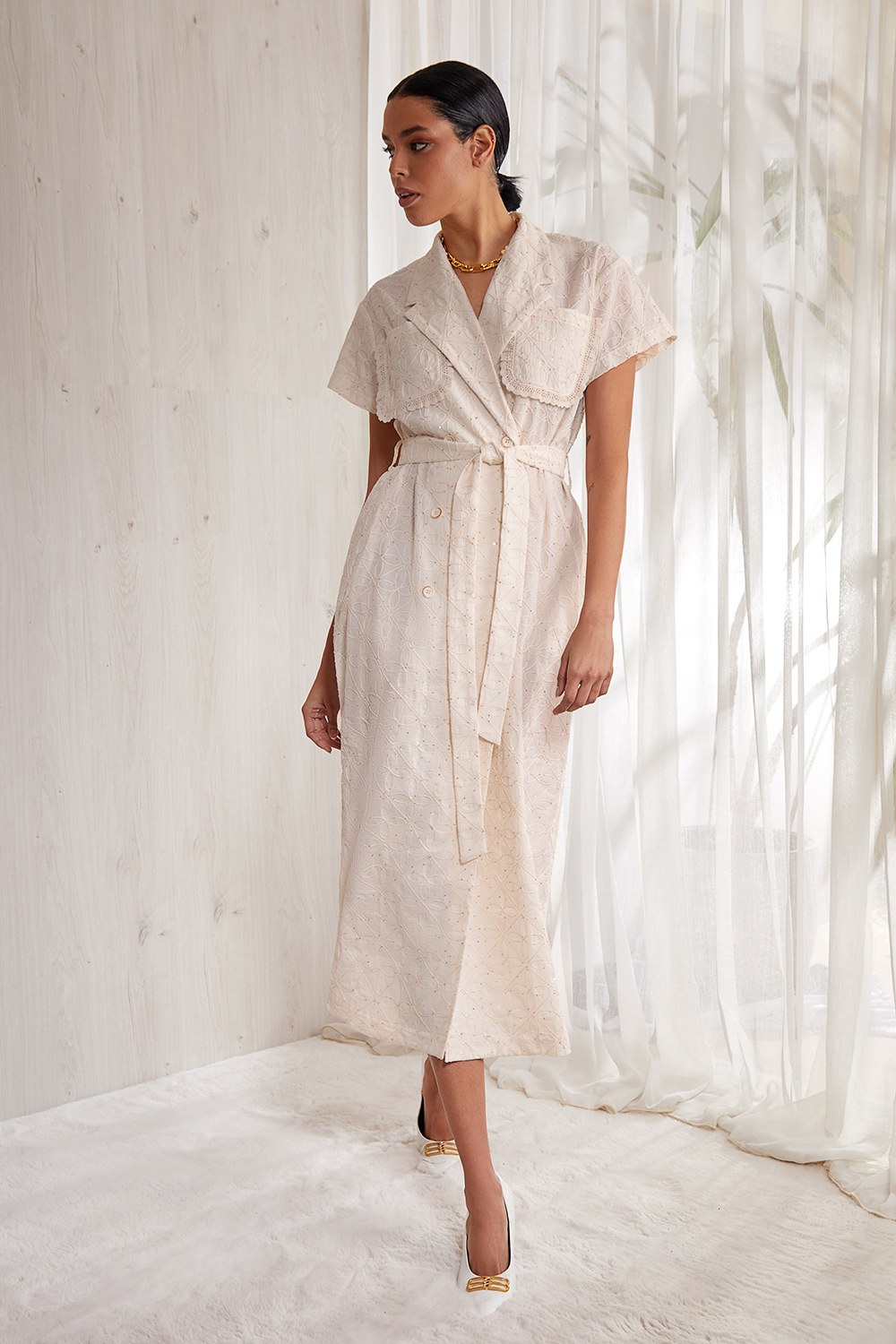 Платье А- образного силуэта,  выполнено из тонкого кружевного  фактурного хлопка ( шитье). Длина мidi. Двубортная  застежка на петли и пуговицы. Воротник пиджачного типа. На полочке накладные карманы, декорированы хлопковым кружевом.  Спинка прямая. В боковых швах карманы.   Чуть спущенная линия плеча. Прямой короткий рукав.
